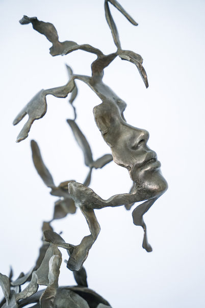 This sculpture is called "Transcendence" and it represents the concept of transcending the physical self. The fragmented pieces rising off the torso symbolizes the process of moving beyond the confines of the physical form to attain a higher state of being.